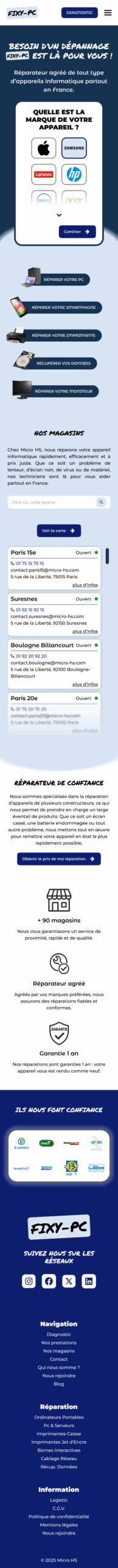 FIXY-PC est une entreprise présente dans plusieurs villes en France et souhaitant digitaliser sa relation client en facilitant la prise de contact en ligne. La maquette propose un pré-formulaire permettant à l’utilisateur de renseigner les informations de son appareil (marque, modèle, problème) . Il est ensuite redirigé vers une page “Diagnostic” pour compléter les données techniques (facture, garantie, numéro IMEI ou SN) ainsi que ses informations personnelles.